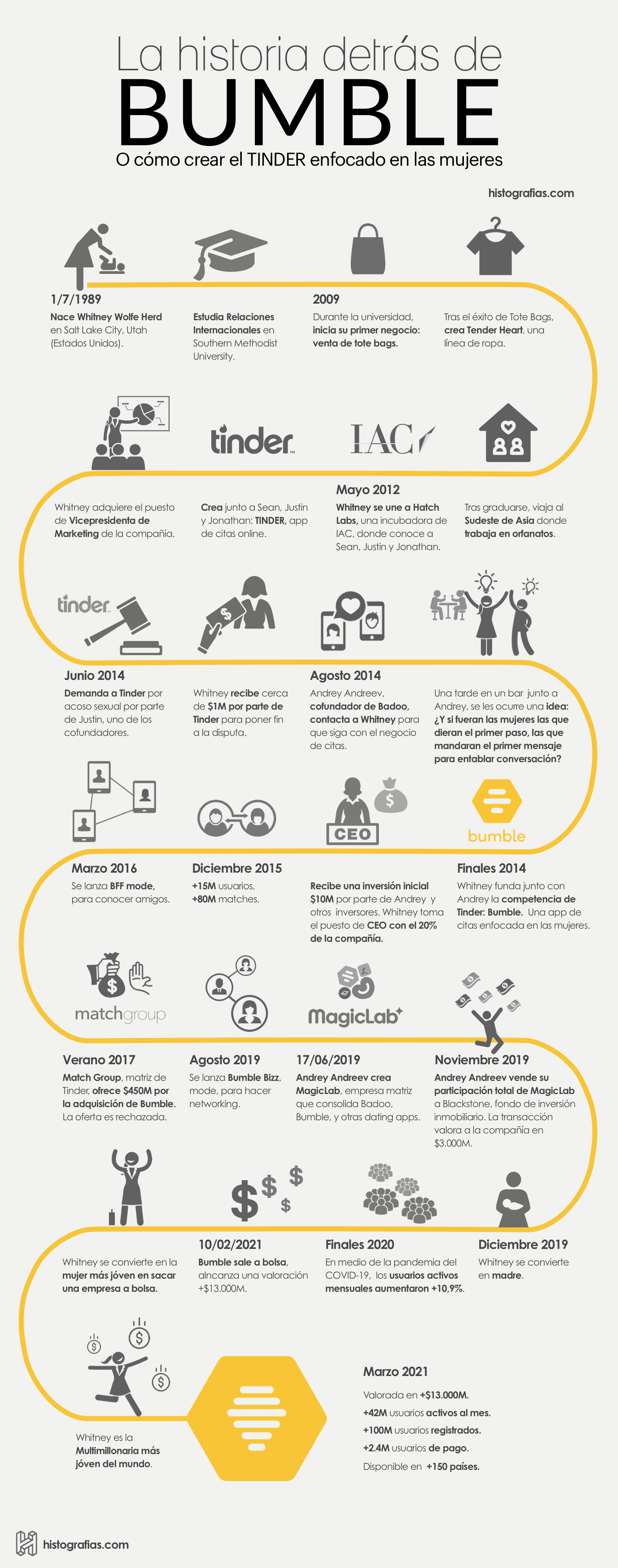 Conoce a través de esta infografía la historia detrás de Bumble y su fundadora Whitney Wolfe, tambiém cofundadora de Tinder.