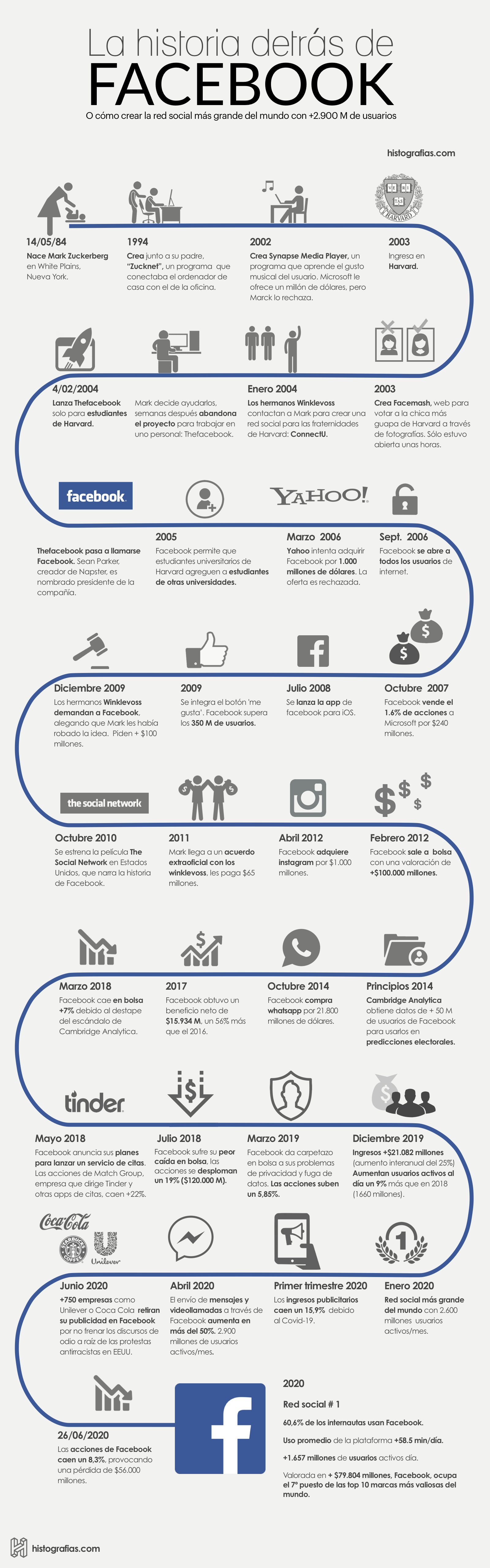 Conoce a través de esta infografía la historia de Facebook, hasta ahora la red social más grande del mundo, desde el nacimiento de su fundador Mark zuckerberg hasta el año 2020.