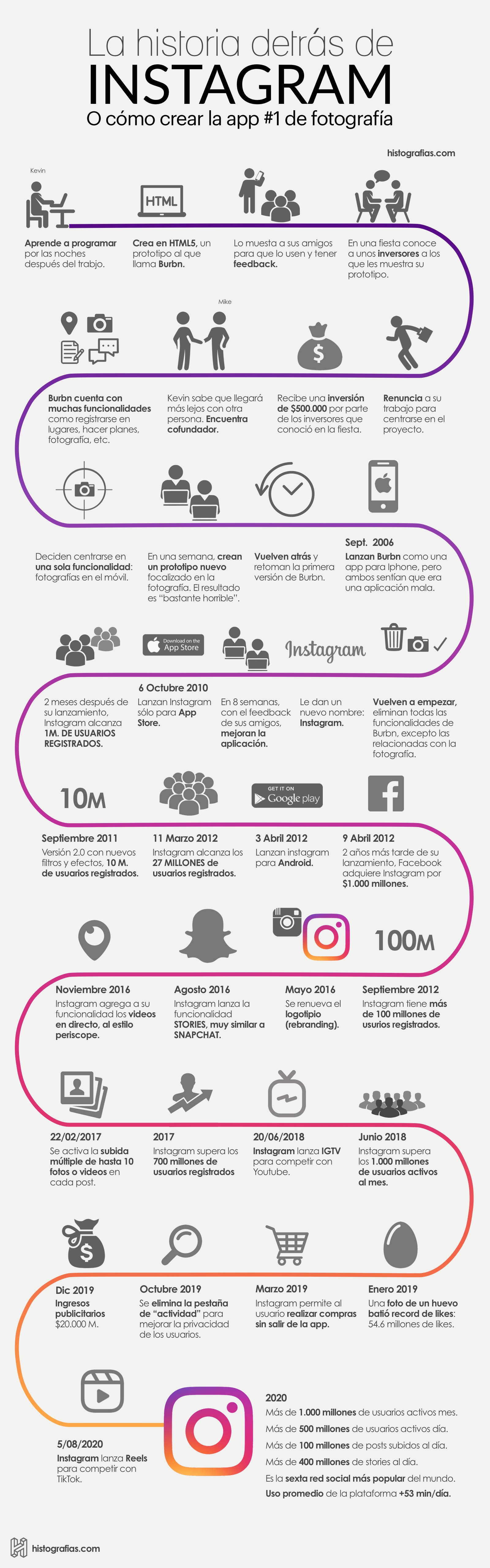Tan sólo dos años después de su lanzamiento, Facebook adquiere la compañía por 1.000 millones de dólares. Desde entonces la plataforma ha multiplicado por más de 20 su base de usuarios, superando hoy en día los 1.000 millones de usuarios activos al mes.