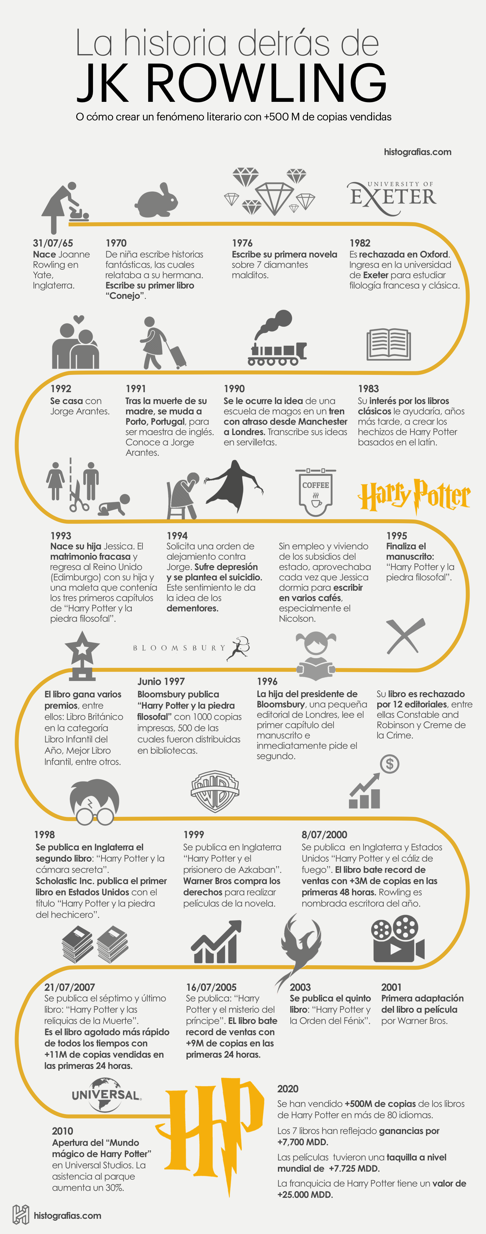 Conoce a través de esta infografía la historia detrás de Harry Potter y la autora de este fenómeno literario JK Rowling.