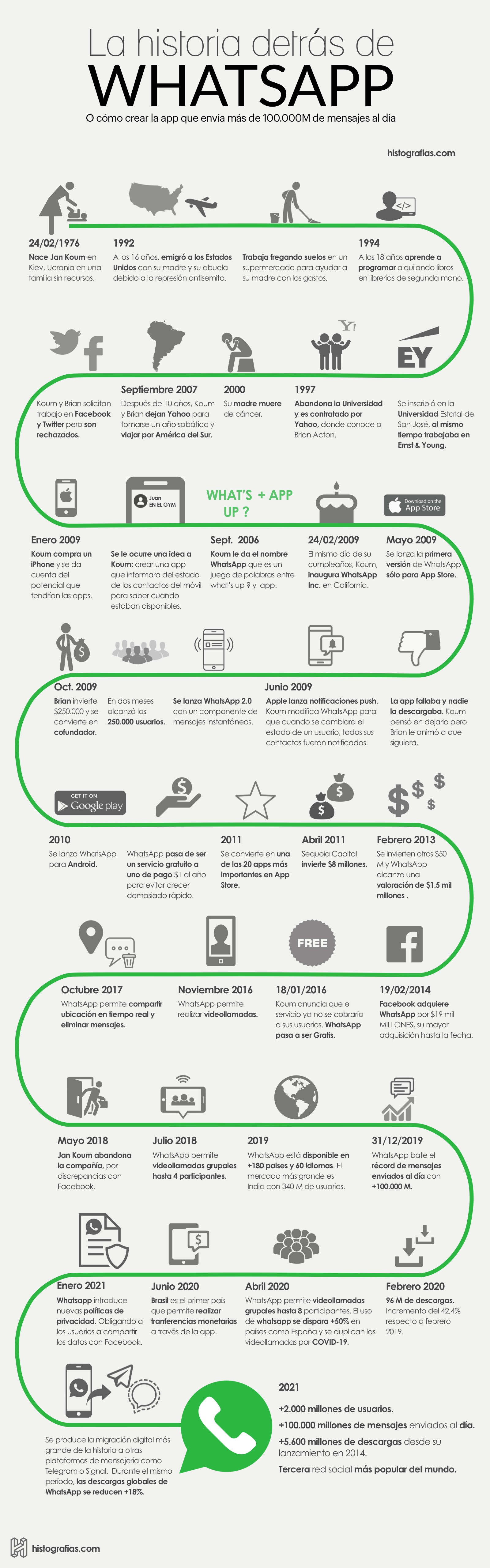 Descubre a través de esta infografía la historia que hay detrás de Whatsapp, la aplicación de mensajes instantáneos más popular del mundo.
