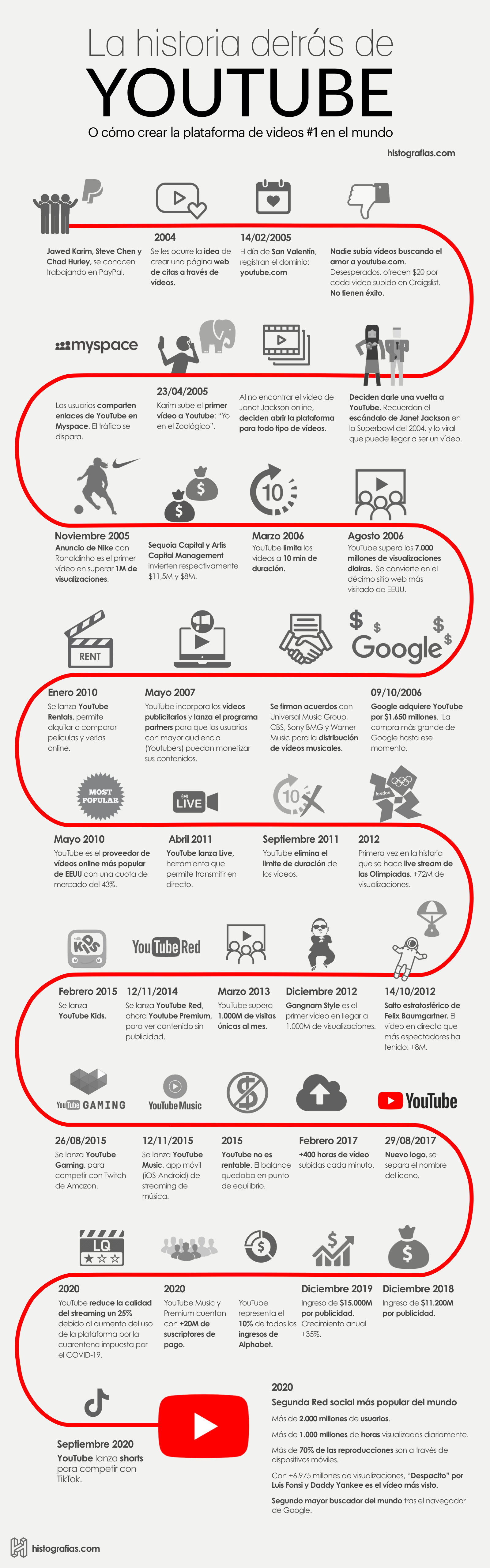 YouTube, la plataforma de videos más grande del mundo, fue adquirida por Google en menos de dos años desde su lanzamiento por $1.650 millones, siendo esta la mayor adquisición de la compañía en ese momento.
