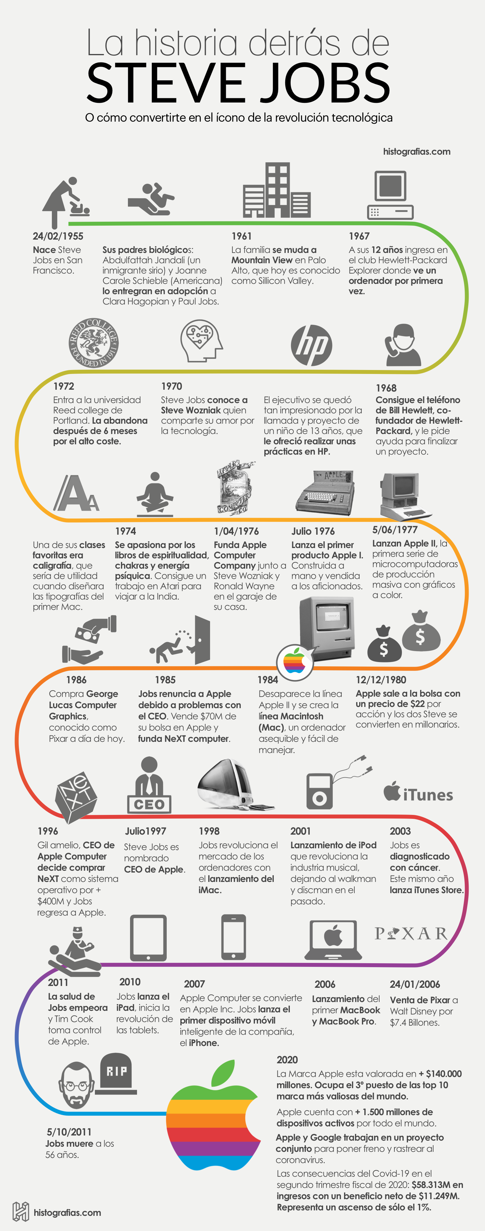 Conoce a través de esta infografía la historia detrás de Steve Jobs, fundador de Apple.